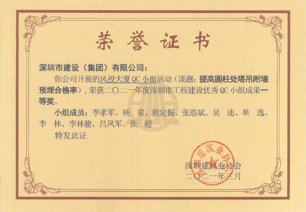 3月12日下午深圳市建筑業協會舉辦了二0二一年度深圳市工程建設QC(優秀質量管理)小組發布會。建設集團風投大廈項目QC小組申報的《提高超高層建筑標準層施工效率》等3個QC成果在資料評比和現場發布等環節中表現優異,榮獲二0二一年度深圳市工程建設優秀QC小組成果一等獎2項...